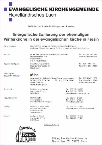 Die Baumaßnahme beinhaltet das Projekt: Versorgungstrakt (Küche und Toilette) des Fördervereins samt Wasser- und Abwasserversorgung sowie ein Zugang zum Turm, somit kommt die Gemeinde ihrem Ziel zur Nutzung der Kirche als Gemeindetreffpunkt sowie als Radfahrerkirche am Havelland-Radweg ein großes Stück näher.