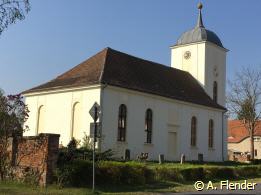 Die Dorfkirche ist eine Saalkirche mit rechteckigem Grundriss, die auf das Jahr 1527 zurückgeht. Sie gilt somit als eines der ältesten Gebäude im Ort. Die Nord- und Südfassaden sind in jeweils fünf Achsen unterteilt. In der mittleren Achse der Südseite befindet sich der Eingang zum Kirchenschiff. Das abgewalmte Dach ist mit einer Kronendeckung aus Biberschwanzziegeln gedeckt. Der massive Westturm ist das höchste Gebäude im Ort und auch durch seine markante Farbgebung von der nahen Bundesstrasse aus gut sichtbar. Er ist in Anlehnung an das Kirchenschiff durch Lisenen vertikal gegliedert. Der Turmhelm ist als Glockendach ausgebildet und mit einer Zinkeindeckung versehen. Im Innern der Kirche sind u.a. noch der Kanzelaltar erhalten sowie das Votivgemälde aus dem Jahr 1667.